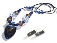 Dark blue hand-painted fused glass pendant with bubbly effects and chunky amber and blue resin beads on a matching colour cotton cord.