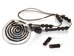Hand-painted fused glass pendant in black and spiral effects with chunky resin and metal beads on a matching colour cotton cord.