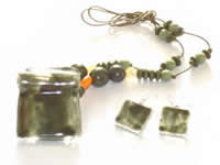 Hand-painted fused glass pendant in deep plain dark green with chunky resin and wooden beads on a matching colour cotton cord